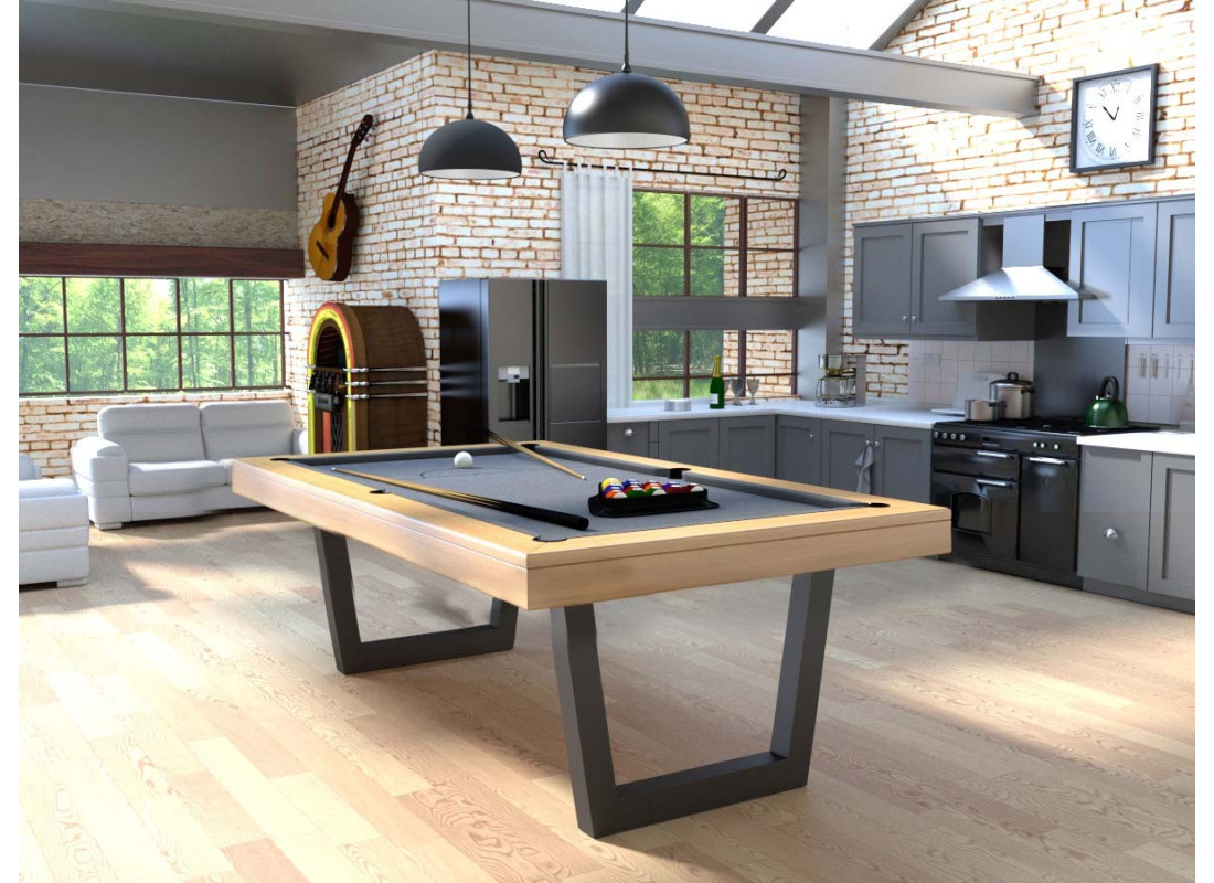 - Контрастні металеві опори у формі трапеції підкреслюють сучасний лофт характер столу і забезпечують стійкість навіть при динамічній грі.